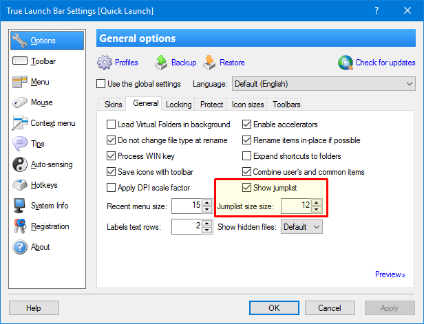 • Check the option "Show jumplist" in the TLB Settings->Options->General. Also you can control the number of items in jumplist.