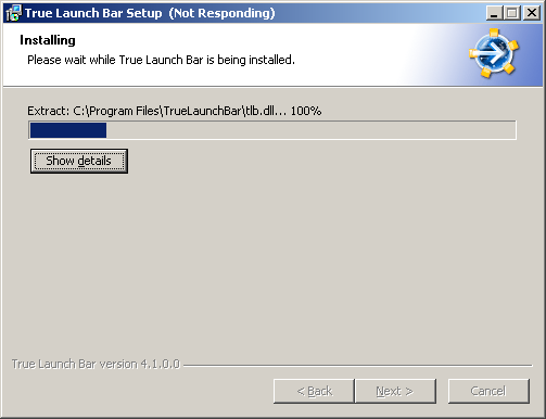 Then I've tried to install the most recent TrueLaunchBar (4.1), but setup application obstinately hangs up in the process of installation. Both 'full' and 'mini' setup distributions has been tried - there was no difference.