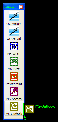 Quote:After my Office Shortcut Bar post, I fiddled some more with Free Launch Bar, and was able to assemble multiple folders in an undocked Free Launch Bar. The Office Shortcut Bar would print each toolbar's title vertically, instead of showing only a piece of each title horizontally.