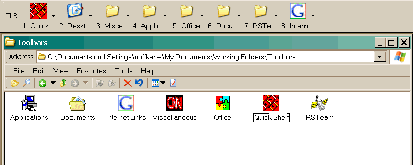 I set up a top level TLB toolbar using generic folder icons, then, using only the Properties context menu selection from menu-clicks of the 8 toolbar menu icons, I tried to replace all the yellow folder icons with descriptive icons from my icon library. I rebooted to get all the new icon images to "stick" (they did not change immediately after I made an icon change through their Properties box), and finished with TLB toolbar icons 3 to 7 not changing, although their corresponding folder icons (see SNAG-0005.gif) changed OK.