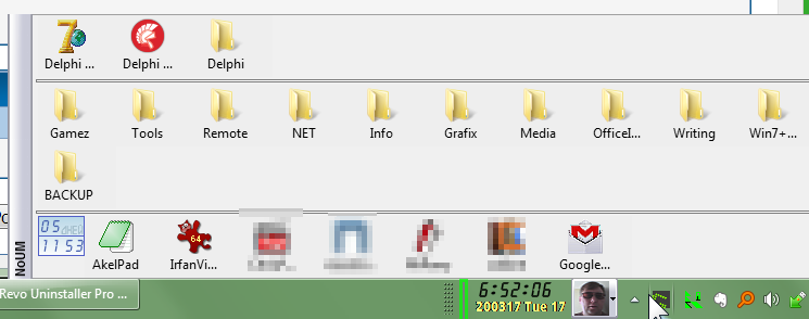 I've been running a two-monitor Windows 7 system since the dawn of time. I came home from a brief sojourn to the hospital last Wednesday (six days ago) and found my right hand Samsung was dead. Took a while to confirm it. But when I finally did, I realized I was going to have to compress my TLB's into one monitor. I already ran a full TLB implementation on the right-hand monitor that included (on the task bar), buttons with menus attached, direct application (usually to be run ON the right hand monitor) icons and a few info tell-tales. On the left-hand monitor, I ran a single menu button with my Hardware Guy's face on it that was for his use.