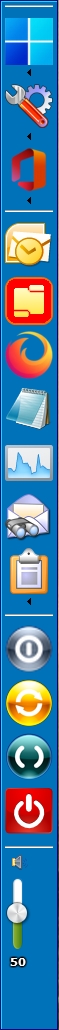 Below: As I did last year, I have been building 1-icon wide TLB toolbars because they are neat and get the job done. First level functionality of TLB remains the shortcuts set on the 'surface' of the Standalone toolbar, whatever its 'width'. These may be shortcuts to applications, Windows functions, and, of course, most famously, 'nested Menus' or Sub-menus. The last, Sub-menus, provide vast flexibility and capacity. Each of us will have our particular preferences for these items. Yet, as before '11', TLB allows reorganization of all these as dictated by experience and by the evolution of your Windows system itself. —