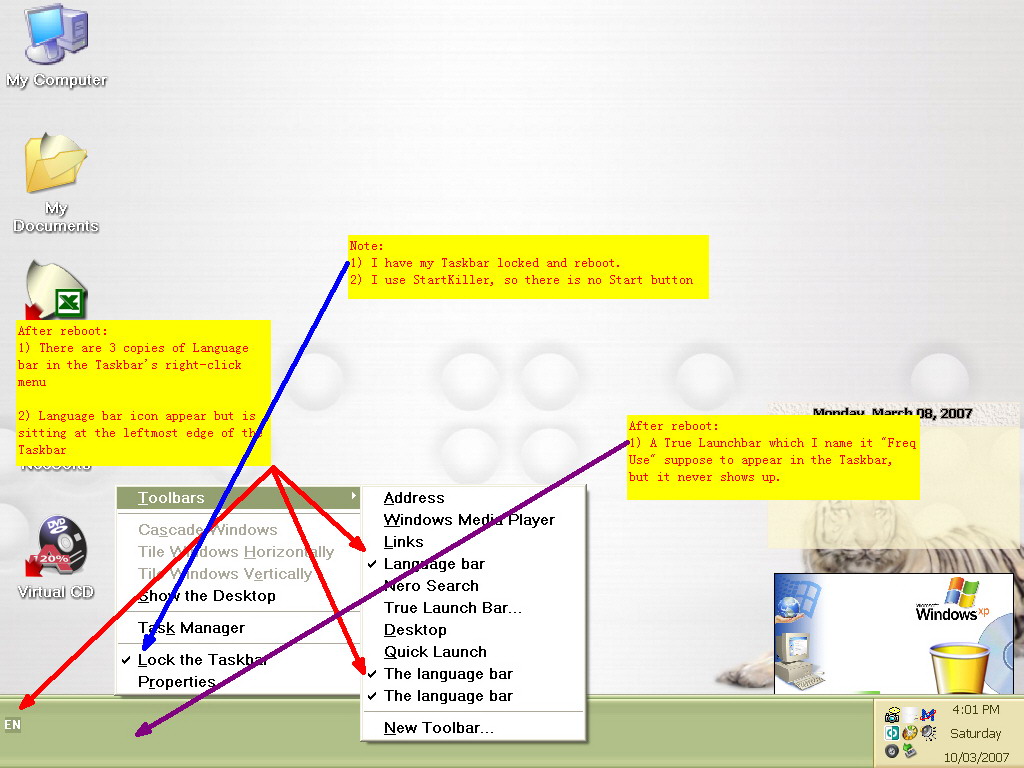It seems previous bug where multiple "Language bar" appear in the taskbar's right-click menu is back and sometime True Launchbar that suppose to appear on Taskbar does not show up at all...