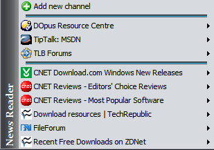 News Reader is the simple RSS Aggregator for True Launch Bar. This plugin show topics from news feeds as menus. You can add any number of channels. Supported formats: RSS, RDF, Atom.