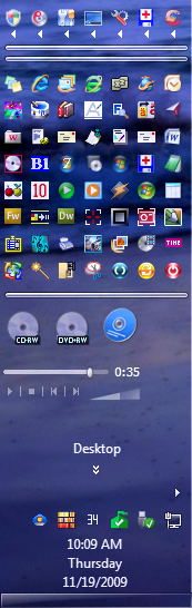 I'm not a TrueSoft newbie, but I am a Windows 7 (W7) newbie, and from that perspective Yuri's 64-bit tear-off toolbar work has saved W7 from unacceptable Taskbar performance. I've attached two .png [1] files showing the sad state of affairs Microsoft has inflicted on W7 buyers. "Toolbar at Bottom.png" shows the W7 toolbar behaving like a good toolbar should, with multiple open applications stacking neatly when its vertical size is increased. Fine, but with modern "Cinemascope" monitors (1600x900 in my case), the screens are too wide and too short to see well except at screen center, from top to bottom. This puts vertical screen space at a premium (at least for me, as my peripheral vision is declining), and forces Taskbar onto the screen sides (in W7, only one side) to free up screen center space for applications (apps). Unfortunately, as shown in the second file, "Toolbar at Side.png", the open apps do not stack together like they should. They just stretch out, leaving little or no space for productive Taskbar/toolbar usage.