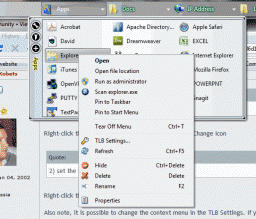 I've been playing with beta 4.4 as a newcomer to TLB. I started with the toolbar version, where, I *think*, right-clicking on the menu icon had an option to CHANGE ICON and HOTKEY. I am running WINDOWS 7 so switched to the Standalone version. For the life of me, I can no longer find 1) the option to change Menu icons, or 2) set the Hotkey for items inside the menu. (E.g., I have a menu containing shortcuts to my most frequently-used apps, and I want to assign hotkeys to some of them.)