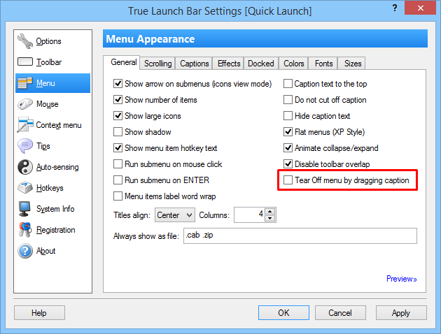 It is possible to tear off menu by dragging by menu caption. You can turn off this feature in TLB Settings->Menu->General (look the attached screenshot).